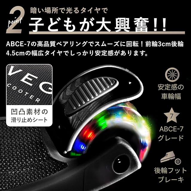 【LED 光るホイール・フットブレーキ】バッテリーが必要なく、速度によってホイールが回転することで自動的にきらきら光るので、夕方でも子供の走行が目立って安心です。車輪の素材は耐摩耗性と耐荷重性に優れる高反発PUを採用し、走行中の音は小さく、振動感も少ない滑らかな走りです。
