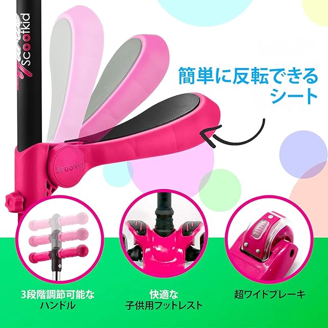 【傾斜式ステアリングテクノロジー】: Translation: 当社の子供用スクーターは、ハンドルを回すのではなく傾けることで制御される傾斜式ステアリングテクノロジーを備えており、簡単な操作が可能です。このデザインは、お子様が乗る間にバランス能力と調整能力を促進します。