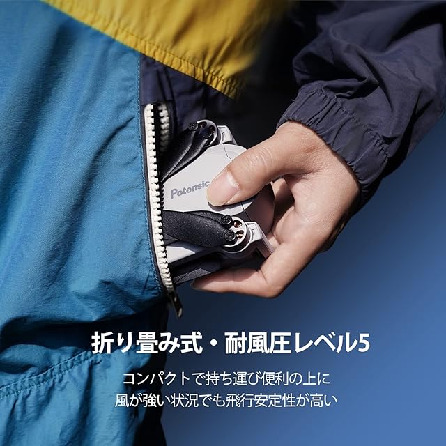 【折り畳み設計&耐風性抜群】折りたためる設計により機体がコンパクトで超軽量、収納バッグも付属されており、旅行中でも持ち運びに便利です。高性能ブラシレスモーターを採用しており、高速、低振動、低ノイズ、優れた安定性、高耐久性で動作できます。風速29〜38 km/hの風にも耐えることができるため、風が強い状況でも飛行安定性が高いです。