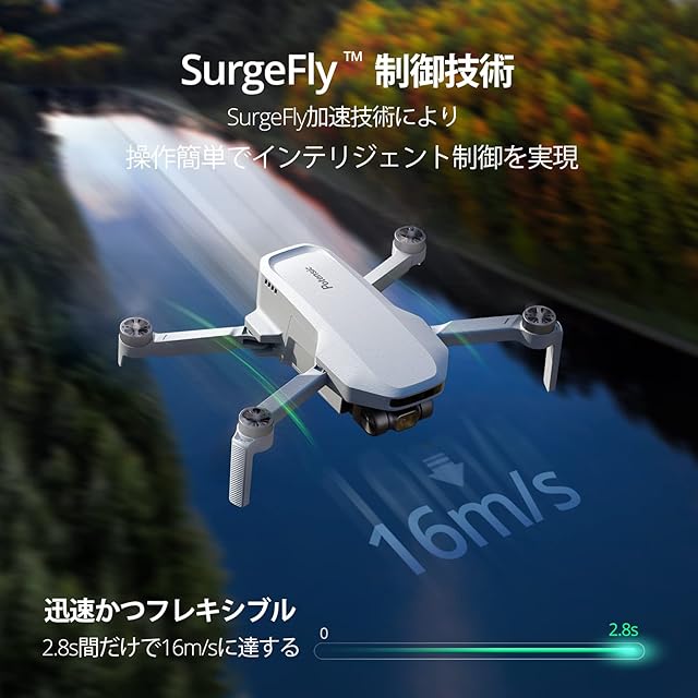 【飛行時間最大62分間】Atom SEドローンは7.2V 2500mAhのバッテリーが2本付き、それぞれ約31分間飛行が可能で、充電の手間も省けますので、合計約62分間のフライトがたっぷりと楽しめます。また、SurgeFly飛行制御システムが搭載されていますので、わずか2.8sで最大水平飛行速度は16m/sに達すことができます。