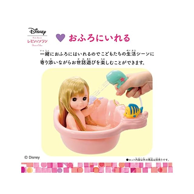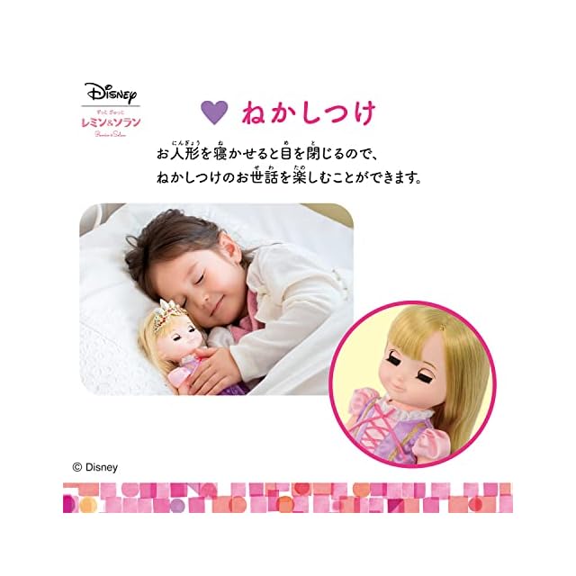 また、金色の長い髪の毛でヘアアレンジ遊びが沢山楽しめるほか、お人形を寝かせると目を閉じるので寝かしつけて遊んだり、一緒にお風呂に入って遊んだり、基本のお世話遊びも楽しめます。