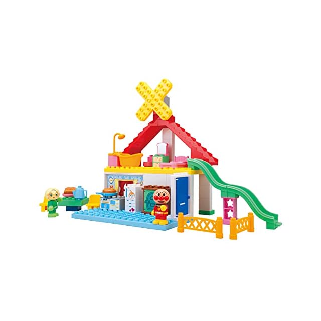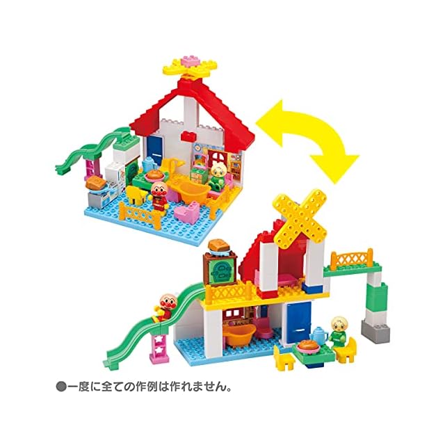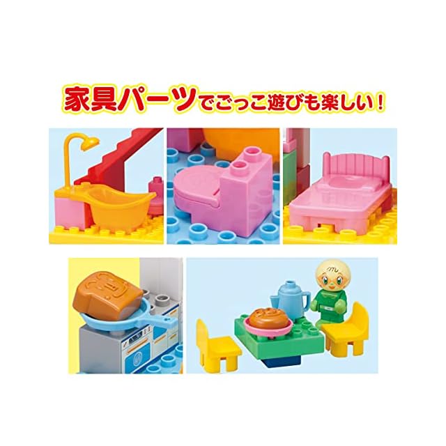 トイレやベッドなどの豊富な家具や、くるくる回る風車などの楽しいパーツが付属しています。パン工場や、1階建て・2階建て・3階建て・車庫付きのおうちなど、様々なものを作ることができます。