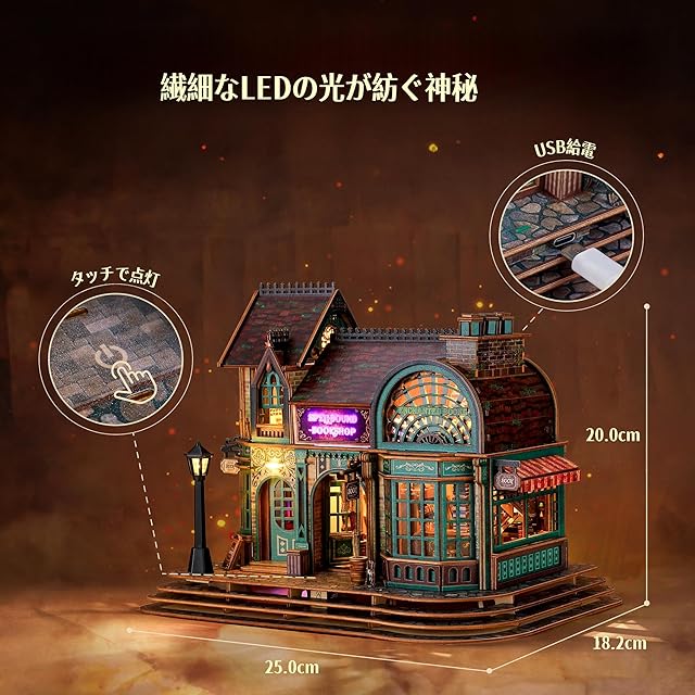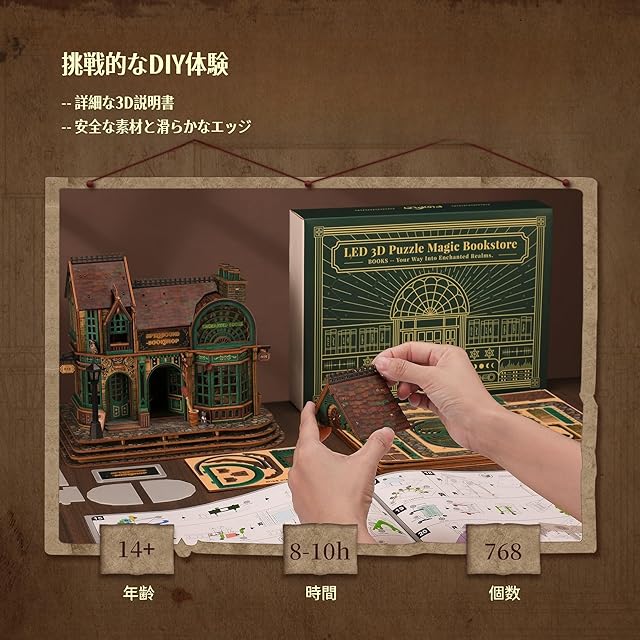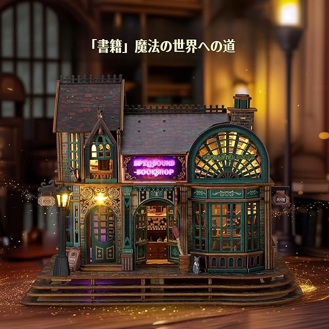 【プレミアム素材と精巧な職人技】768個の丈夫な木製ピースから作られたこの3Dパズルは、弾力性と精巧なディテールを兼ね備えています。繊細な書店の窓、クリスタルのランプ、発光するドアプレート、幻想的な建築のアクセントなど、このモデルには絶妙な特徴があります。