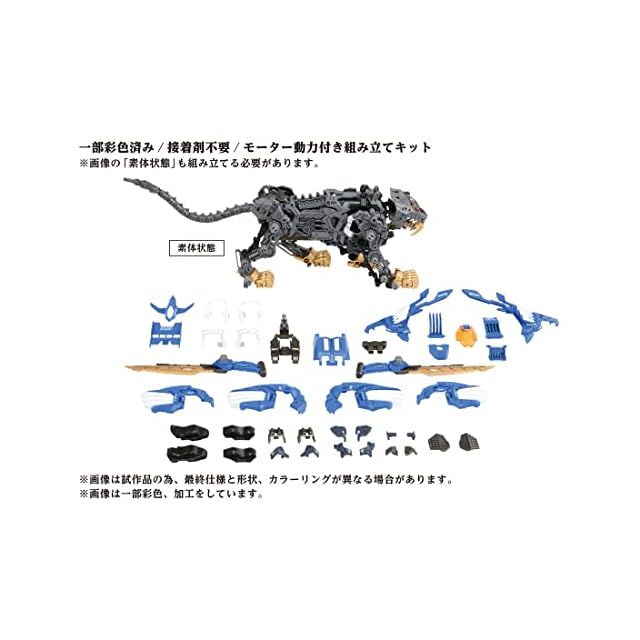 1/72スケールの組立キット。電動ユニットによりスイッチを入れることで動物のリアルな歩行を再現、目や胸部がLEDで点灯します。アニメで特徴的だった、タテガミのEシールドジェネレーター、脚部のコンプリッションリフリジェレイター、背中のブースターなどの各パーツが可動(手動)。ブレードライガーの最大の武器であるレーザーブレードは展開可能で、パルスレーザーガン発射形態時は基部を延長することでアニメの劇中の射撃状態を現可能です。コックピットに搭乗可能な、1/72の初代アニメの主人公バン、ヒロインのフィーネのフィギュアが付属(無塗装)。付属の台座にのせることで、その場で歩行動作を楽しむことも可能です。