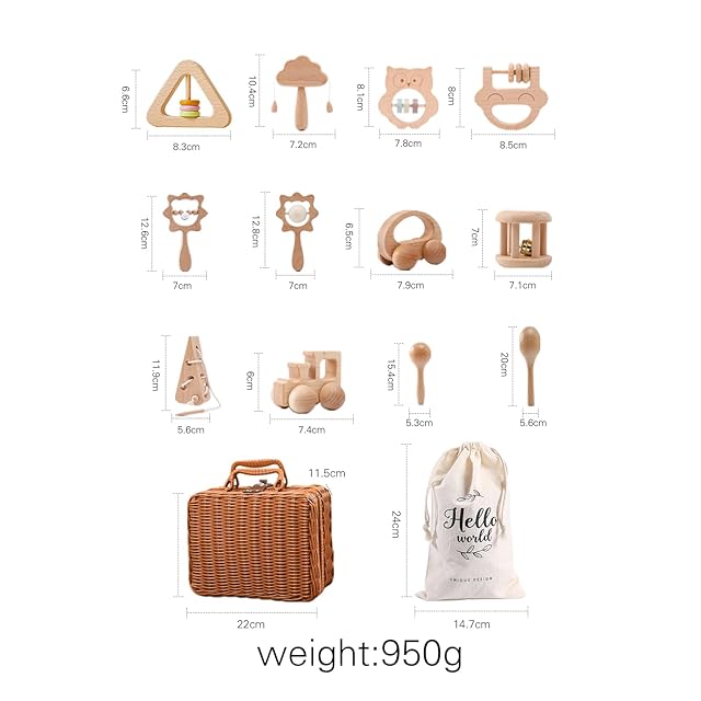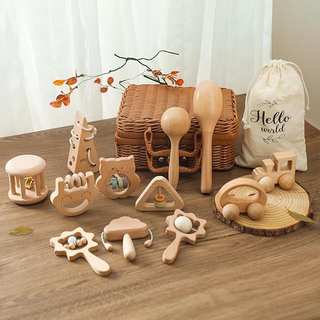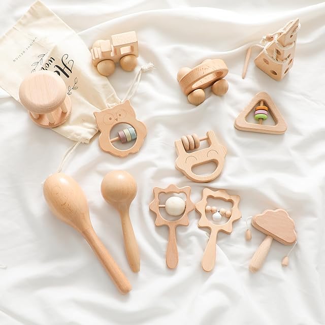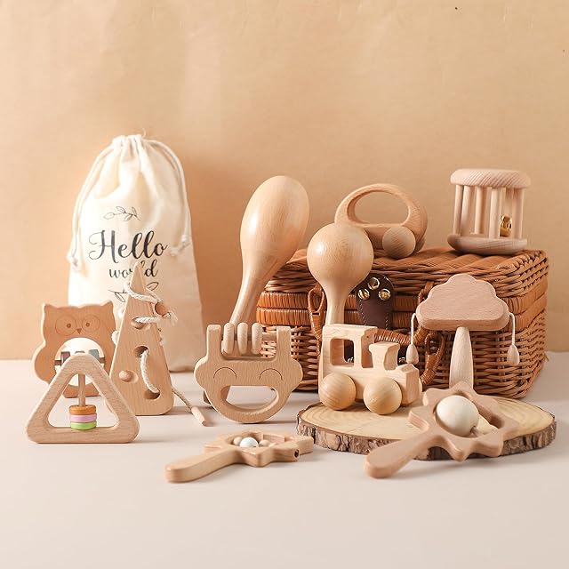 Promise Babe おもちゃ がらがら ラトル 天然木 出産祝い 豪華12点セット ガラガラ 赤ちゃん 木の揺れる音 子供 プレゼント 新生児贈り物 収納用箱付き