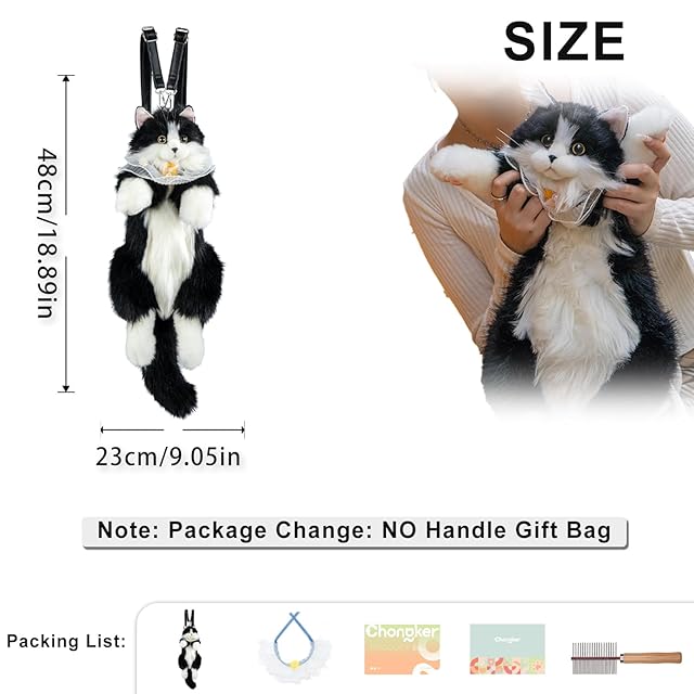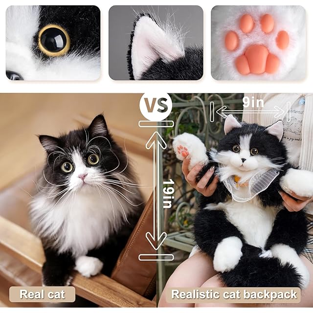 Chongker 猫ぬいぐるみ 本物そっくり - リアルな猫型リュック、手作り、猫のぬいぐるみペット、可愛らしい外観、適切な容量、素敵なアクセサリー、黒猫リュック
