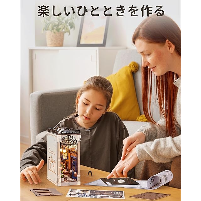 「初心者に優しい組立キット」木製の簡単なカットアウト組み立てで、約3時間で完成します。大人も子供も楽しめます。接着剤不要で、ピースをはめ込むだけで手を汚さずに組み立てられます。リラックスタイムや親子の時間など、様々なシーンで楽しめます。