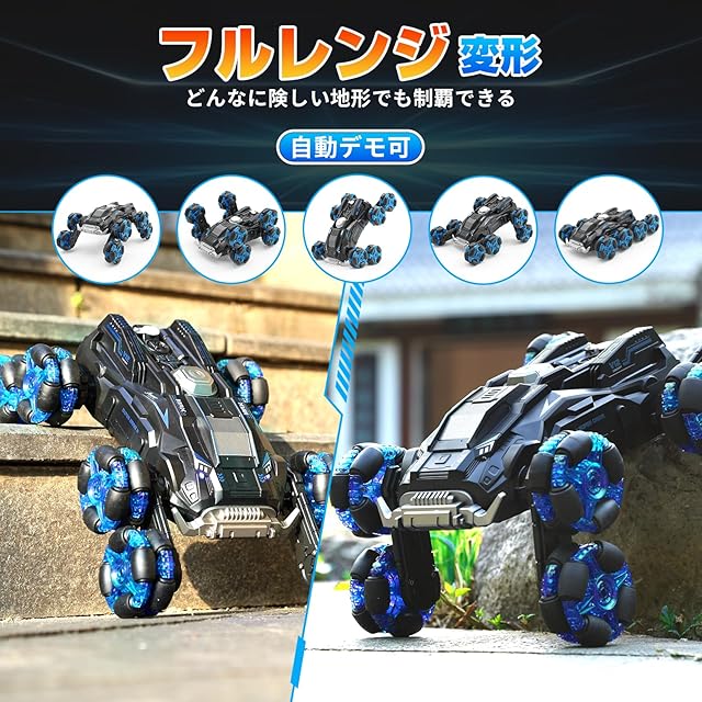 【驚異な8WD!さまざまな地形に対応】このラジコンカーは8輪駆動システムを搭載、プレイヤーに非常に満足いただける冒険と楽しみを提供します。ロボットのように変形可能で、段差の多い地面や草地、砂浜などオフロード地形を楽々と走行できます。子供への贈り物として非常に適しています。