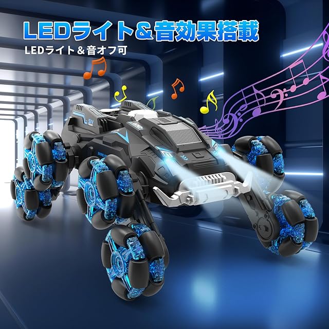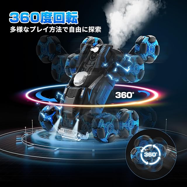 【360度回転&音声効果&スプレー機能】このリモコンカーは360度回転が可能で、鮮やかなLEDライトと楽しいスプレー機能を備えています。しかも、音声効果も搭載しており、必要に応じて音声とライトをオフにすることができます。これらの機能により、室内や屋外、どこでも驚きと楽しみを満足できます。