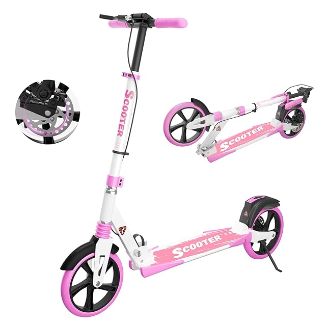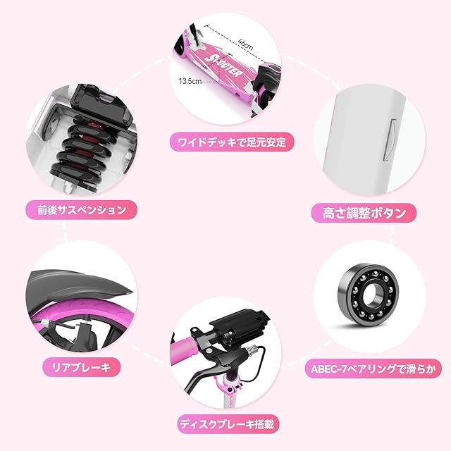 MEE GOO【2025年 発売】 折りたたみキックボード 大人用キックスクーター ディスクブレーキ&リアブレーキ 二重サスペンション搭載 高さ四段階調節可能 200mm PUホイール ABEC-7ベアリング 耐滑ワイドデッキ 耐荷重100kg (ピンク)