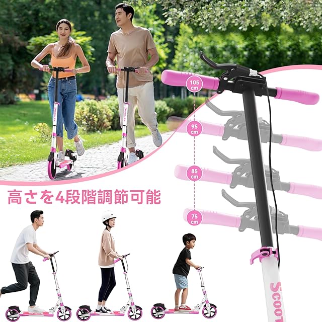 【人間工学に基づいた設計】ハンドル高さが4段階調節可能で、家族間での共有や体格に合わせた最適なポジション設定が簡単になります。広めの耐滑デッキ(46×13.5cm)と調整可能なハンドルバーで、大人やティーンエイジャーに最適な安全性と快適性を提供できます。