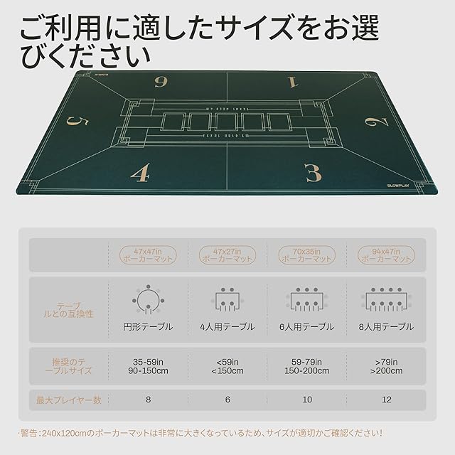 持ち運び&収納:厚さたった2mmのマットは、巻いて仕舞えば場所を取らずとてもコンパクトに収納することができます。おしゃれに収納して、いつでもどこへでもポーカーを楽しみましょう。※120x70cmサイズのポーカーマットにはキャリーバッグは付属しません。小さく丸めていただけますので、そのままお持ち運びいただくことをお勧めいたします。
