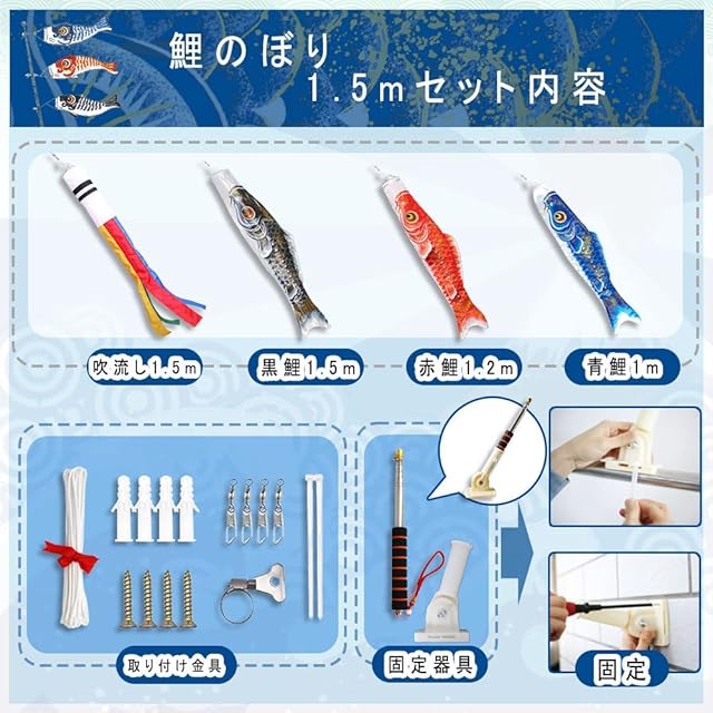 【ベランダ用鯉のぼり】簡単設置、ベランダに取り付けやすい固定器具付き。とても簡単、安全にベランダに取り付けられます。本製品が付属の説明書に加え。ベランダで泳ぐ鯉のぼりのように、きれいな景色が表しています!