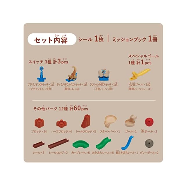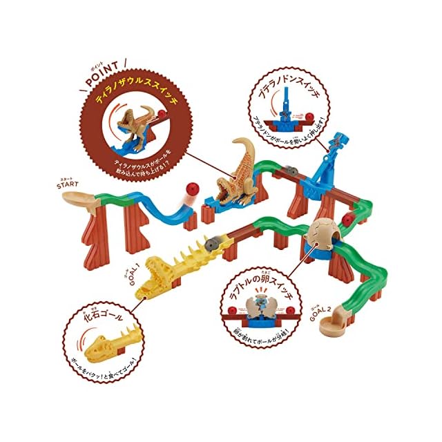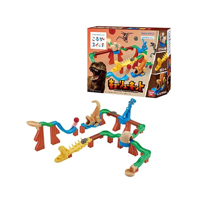高いコースにボールを持ち上げる「ティラノザウルススイッチ」や、ボールが二手に分かれる「ラプトルの卵スイッチ」など、キョーリューキットオリジナルのスイッチがたくさん入ったセットです。