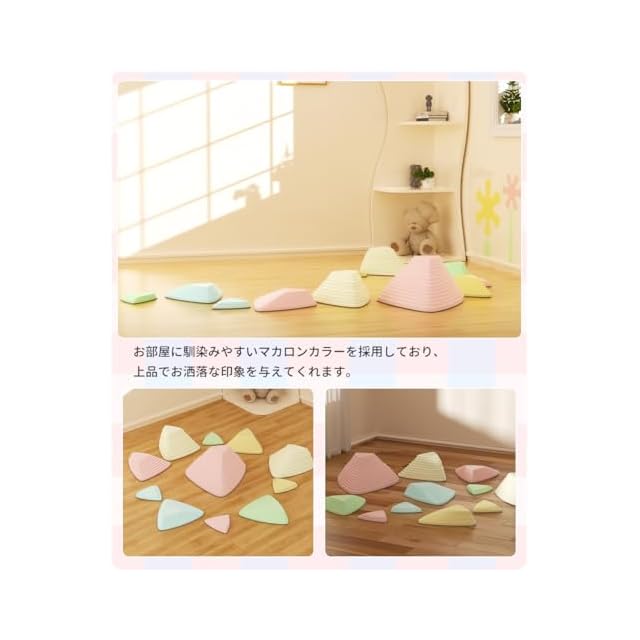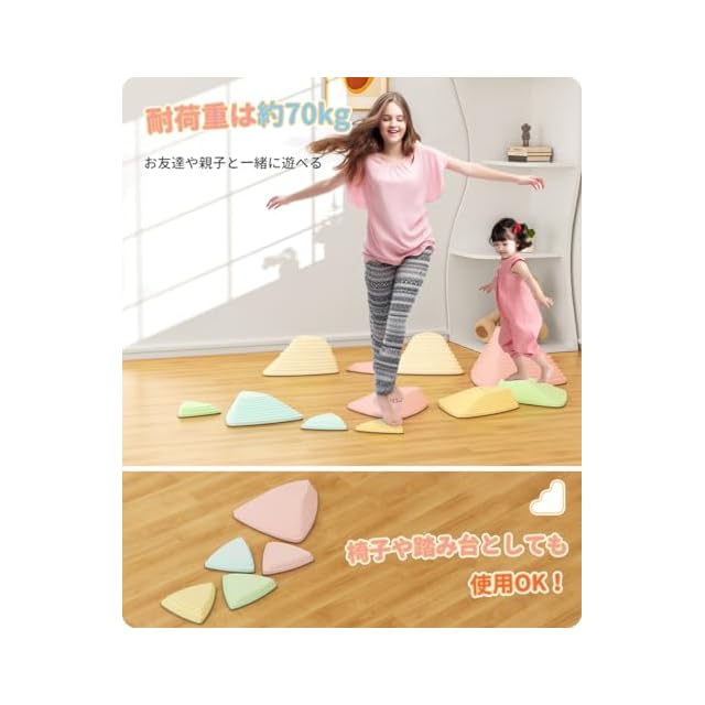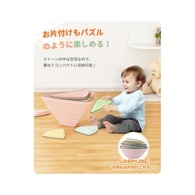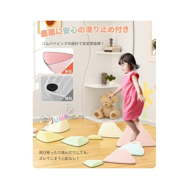【安全に遊べる設計】ストーンの底には滑り止めがついているため、滑っても動きにくく安全です。内部は空洞になっており、とても軽いので小さな子供でも簡単に移動や設置ができます。さらに、重ねて収納することができるので、遊び終わった後の片付けも楽しくなります。