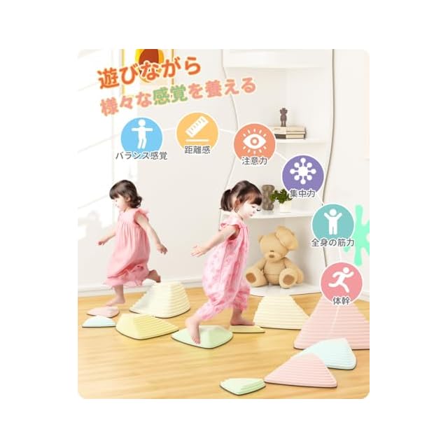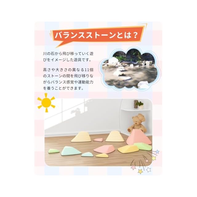 【室内外で使用可能】バランスストーンは、川の石を飛び移る遊びをイメージした玩具です。ストーンの上を飛び移ることでバランス感覚を養うことができ、ご家庭での遊びとトレーニングに最適です。また、幼児体育教室、幼稚園、保育園、児童館、学童保育、小学校、誕生日プレゼントやクリスマスギフトなど、さまざまな場面で活用できます。
