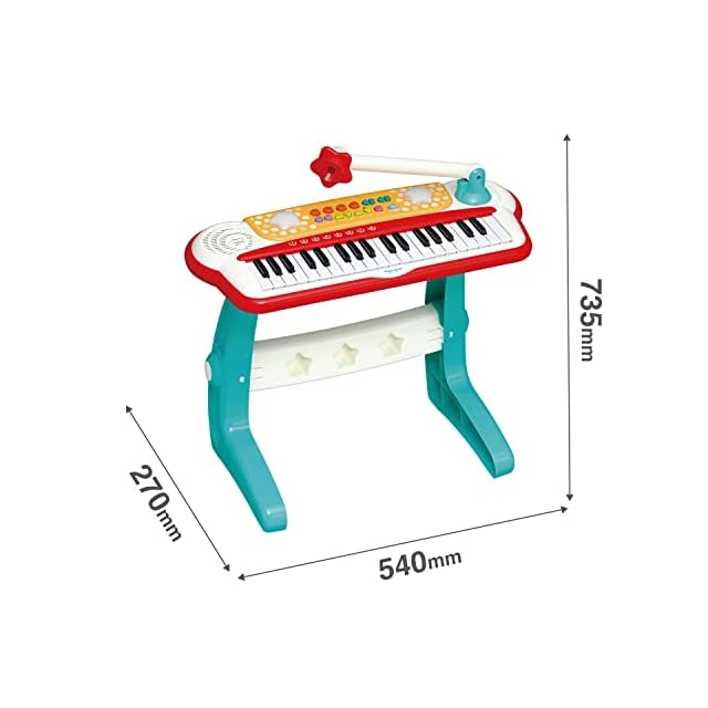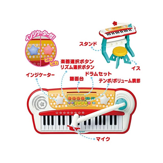 【楽譜と音程シール付き】 簡単楽譜&ドレミシール付きになって、さらに遊びやすくなりました。 リズムに合わせてピカピカ光る星形のインジケーターがキーボードあそびを盛り上げます。お子さまに大好評のマイクもついてきます。