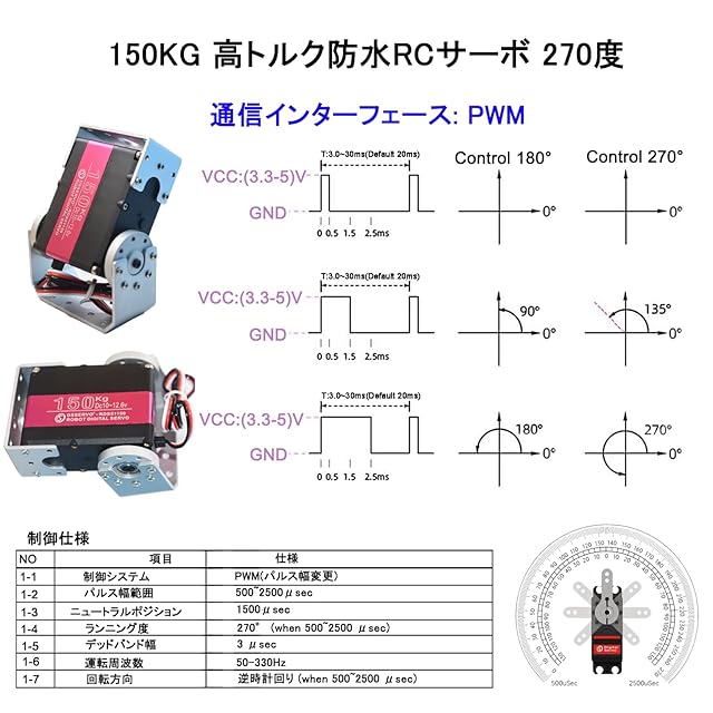 [PWM制御方式] - 制御方式はPWM(パルス幅変調)です。パルス幅範囲は500~2500μsecです。最大動作角度:500~2500μsecのとき270°±3°。