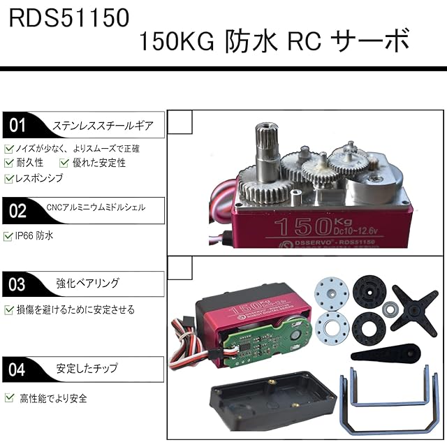 [RDS51150 150KG大トルクサーボ]--電圧:10V-12.6V----大トルク:150kg.cm.at(10v)、165kg.cm.at(12v)、173kg.cm.at(12.6v)---速度:0.24秒/60度at(10v)、0.21秒/60度at(12v)、0.19秒/60度at(12.6v)---動作角度:270度(500-2500μsec)。