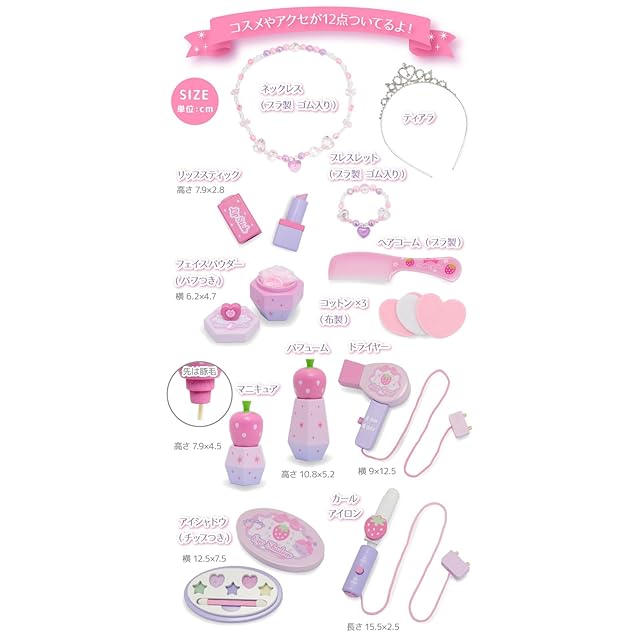 【セット内容】 ・ドレッサー本体 ・アイシャドウ(チップ付き) ・フェイスパウダー(パフ付き) ・リップスティック(回すとリップが出ます) ・マニキュア(筆部分はブラシタイプ) ・パフューム(フタを外してプッシュできます) ・ドライヤー ・カールアイロン ・コットン×3(布製) ・ティアラ(金属製) ◇プラスチック製パーツ◇ ・ヘアコーム ・ネックレス ・ブレスレット
