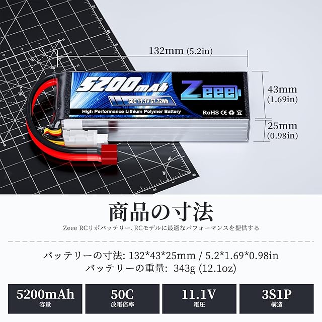 【高性能】ゼエエ(Zeee)11.1V 50C 5200mAh リポバッテリーは日本と韓国からの優れたリチウムポリマー素材があります。そして、最大のエネルギー密度が235Wh/kgまで。リポバッテリーはメモリー効果がないので、昼休みや時間がある時に充電しても、いずれ問題がないです。