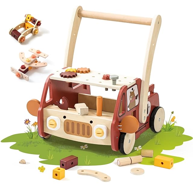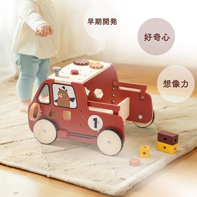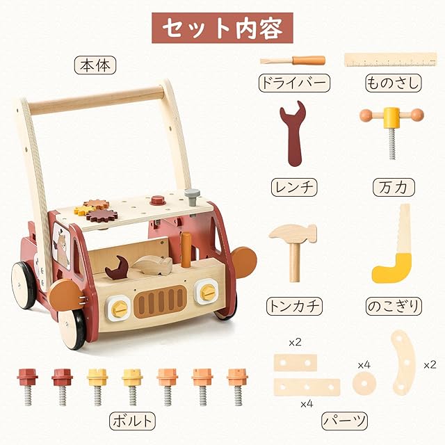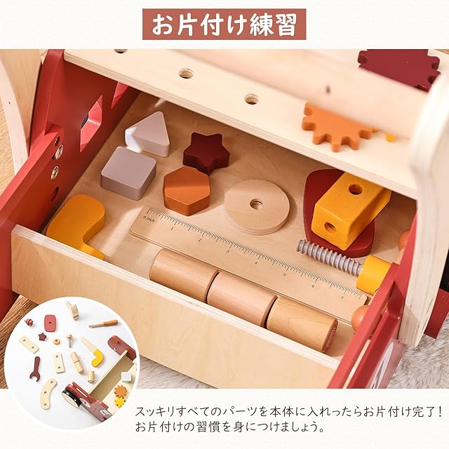 【バランス&指先運動】つかまり立ちやよちよち歩きを始めた赤ちゃんのサポートをしてくれます。ドライバーやレンチ、ハンマーを使って木製パーツを組み合わせたり大工遊びを楽しめことで脳の発達を促します。