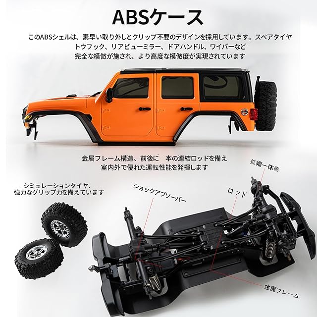 【改装可能で、完全な詳細を持つリアルな車モデル】:ラジコンジープはABSボディを採用し、クイックリリースのボディクリップデザインを採用し、完全なリアルなディテールを持っています。予備タイヤ、トレーラーヒッチ、リアビューミラー、ドアハンドル、ワイパーなどのリアルなディテールが含まれています。また、リタオさんは、皆さんが自分の愛車をDIYするための豊富な純正改装パーツを用意しています。リアルなクライミングがもたらす操作と改装の楽しみをすぐにお楽しみください。