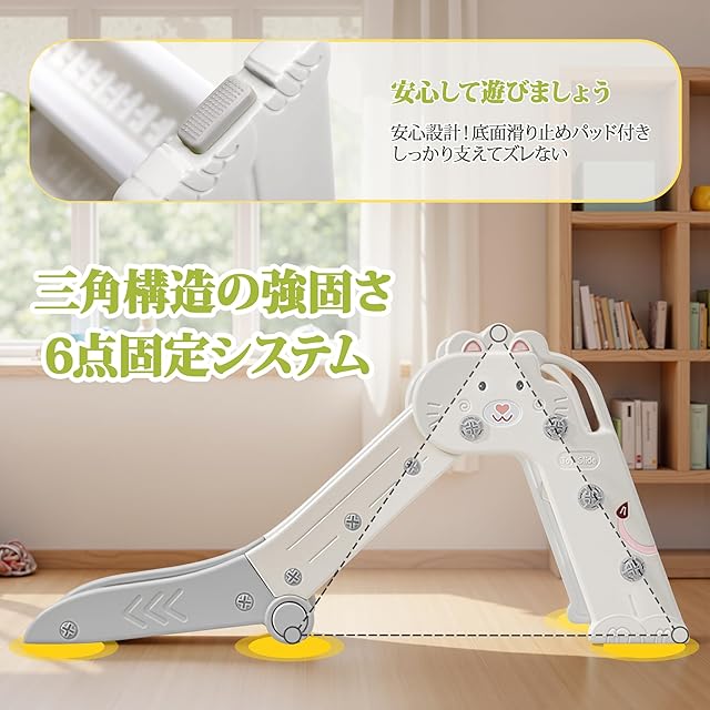【HDPE素材&安定構造】 滑り台は無臭のHDPE素材を使用しておりまして、変形しにくく耐久性に優れております。角の丸み加工と三角形構造により、安全性と安定性を両立させた室内遊具となっております。