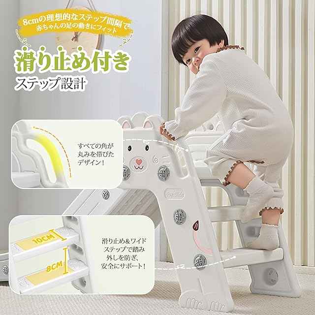 【8cmの段差&滑り止めペダル】 8cmの段差は赤ちゃんの足上げ動作に配慮した設計となっており、凹凸模様と広めのペダルで踏み外しを防止いたします。ママとパパが安心するすべり台の選択でございます。