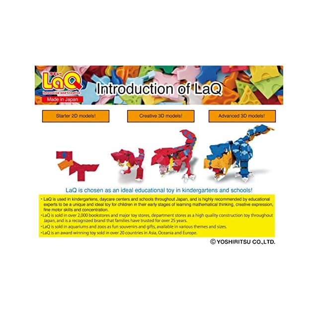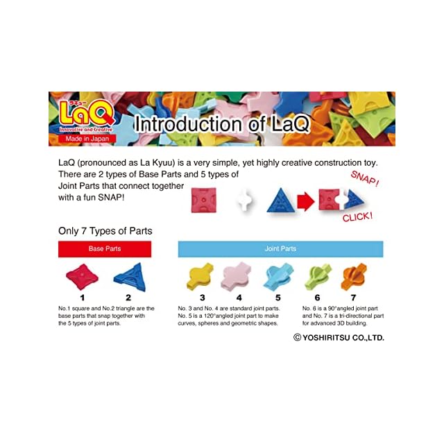 そして、作れる作例数はなんと100種類!! ※全てのモデルを同時に作ることはできません。 さらに!パーツをはずすのに便利なパーツリムーバーとお片付けに便利な収納ケース付き!! LaQパーツがバランスよく入っているからLaQ(ラキュー)が初めての方の入門編にもバッチリです!! もちろん、パーツ増量商品で上級者の方にもおススメのセットです。