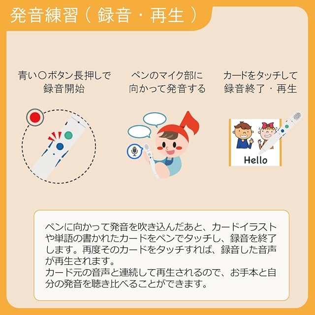 オトデルペン オトデルペンは、紙に印刷されているドットコード(極小の点で構成された二次元コード)を読み取り、対応する音声を再生するペン型ツールです。USB充電式で、繰り返し使用することができます。また英語と日本語、2ヶ国語を切り替えて聴いたり、自分の声を録音して、カードにリンクさせることもできます。 ・製品サイズ:142×22×19 mm、約26g ・連続再生時間:3時間以上(弊社試験基準)