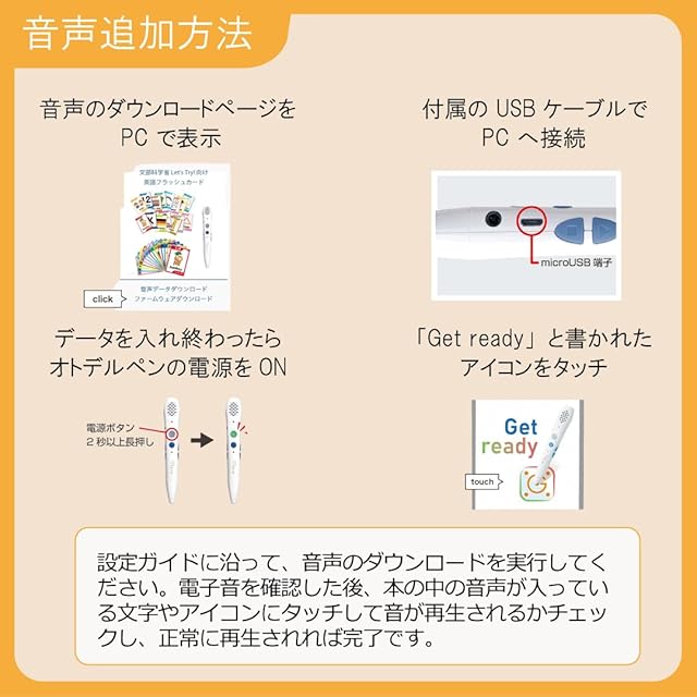 ※オトデルペンは、オトデルシリーズの教材で使用できる共通ペンです。本商品以外のオトデル教材を使用する場合は、お客様自身でPCにて音声データをダウンロードし、ペンに追加していただく必要があります。