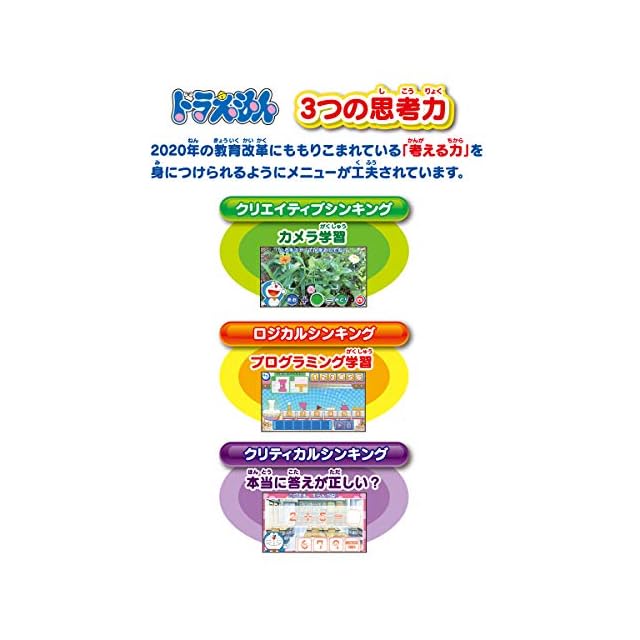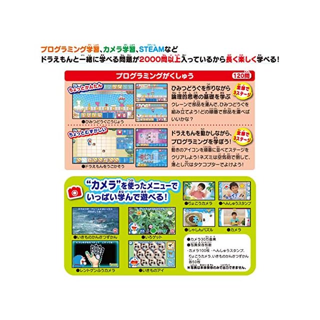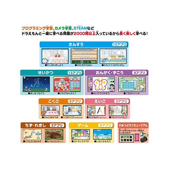 プログラミング学習、カメラ学習、STEAMや教科学習などドラえもんと一緒に学べる問題が2000問以上はいって長く楽しく学べます。小学校入学準備に最適です。