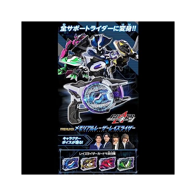 セットには「レーザーレイズライザー(メモリアルver.)」のほかに、「レイズライザーカード」が4枚付属。レーザーレイズライザー(メモリアルver.)にセットすることで各サポートライダーへの変身音が発動します。
