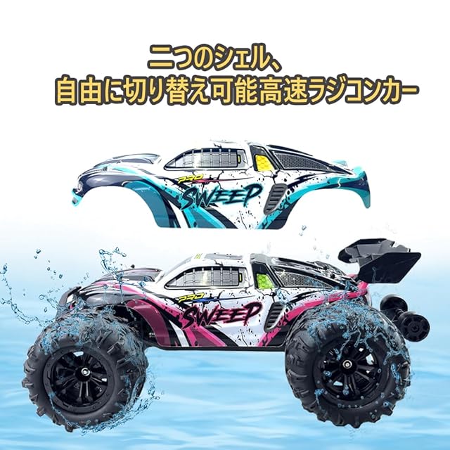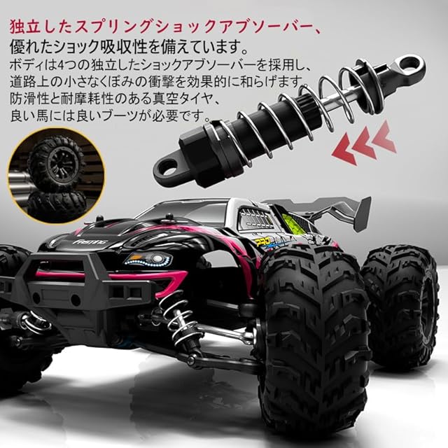 【70 km/hブラシレスモーター ラジコンカー】:当社のモンスタートラックは最高速度70 km/h(43.4 mph)に達し、高速、中速、低速の3つのモードの速度調整が可能です。子どもたちの大好きなおもちゃ。2つのバッテリーを搭載し、速度や操作により使用時間は30-50分(速度と取り扱いに依存)提供されます。16個の金属ベアリングを搭載し、効果的にパワーロスを減少させ、大型のバキュームタイヤはさまざまな荒れ地に対応するよう設計されています。