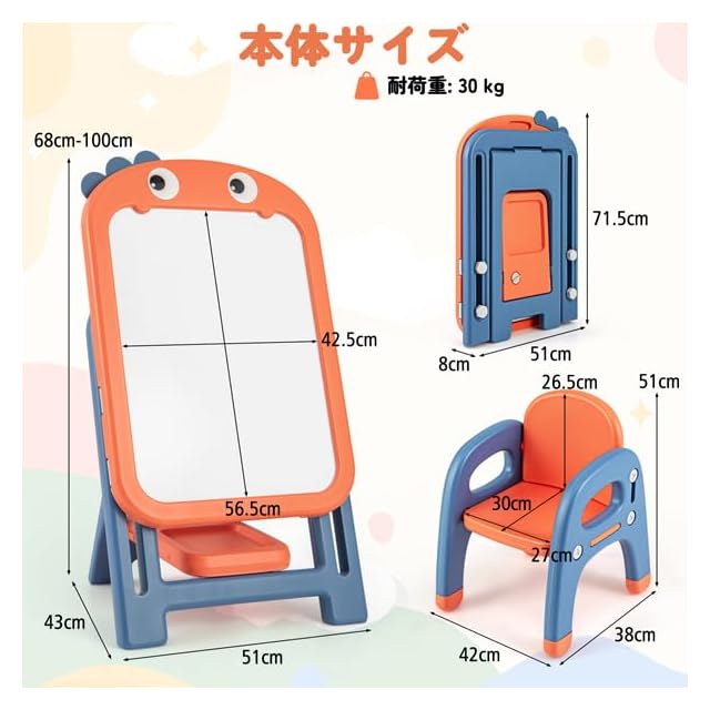 お絵描きボードのサイズ:幅51x奥行き43x高さ68-100cm /お絵描きボードの折りたたみサイズ:幅51x奥行き8x高さ71.5cm / チェアのサイズ:幅42x奥行き38x高さ51cm / チェアの耐荷重:30kg