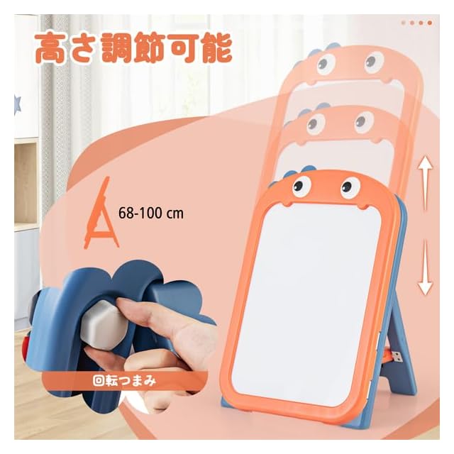 【自由に調節できる高さ】 お絵描きボードには4つの調節ボタンがあり、68cmから100cmの範囲で高さを簡単に調整できます。座って使うのはもちろん、立って使うこともでき、成長に合わせた使い方ができます。さらに、高さ調整可能なボードは、子どもの成長段階に合わせて最適な位置で使えます。