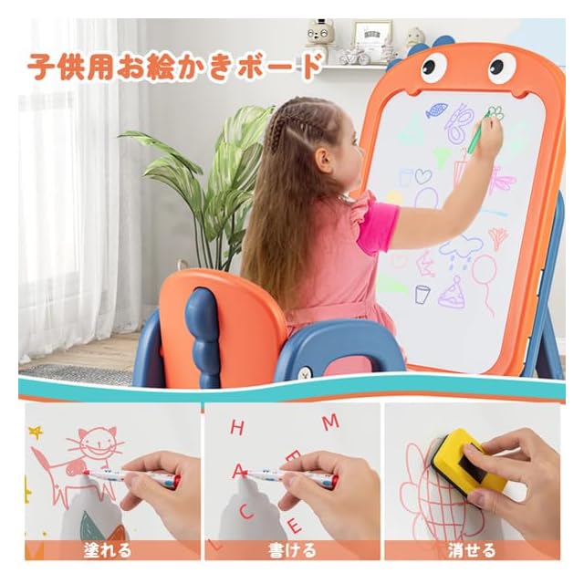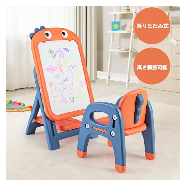 Giantex お絵描きボード 子供用 チェア付き 高さ調節可能 折りたたみ式 豊富なアクセサリ イーゼル 大きい 無臭無毒 HDPE製 描画と消去が簡単 ホワイトボード 収納トレイ付き 軽量 知育玩具 子供 おえかきボード 落書き 磁気筆書板 製図板 オレンジ