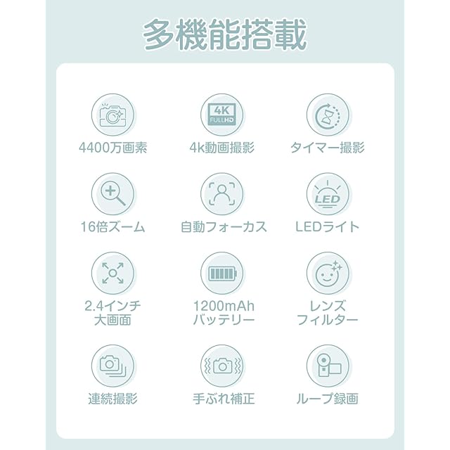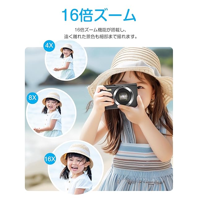 【4K動画録画&4400万画素】このデジカメは最大4Kビデオ解像度と4400万ピクセルで44MP画像解像度を持ち、16倍デジタルズーム機能も搭載しておりますので、W/Tボタンでズームインやズームアウトすることができ、いつでもご家族やお友達との楽しい時間をとらえて記録できます。注* (初めてご使用する前には付属しているメモリーカードをフォーマットする必要があることをご注意ください。)