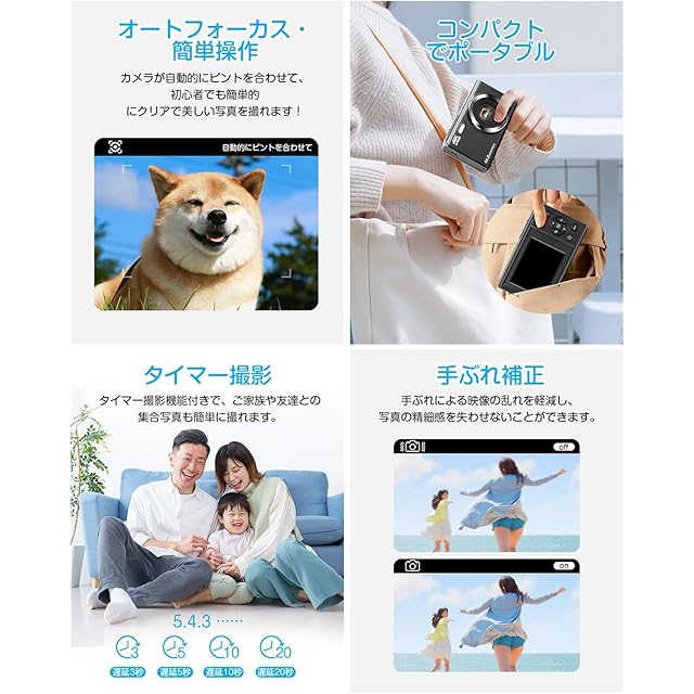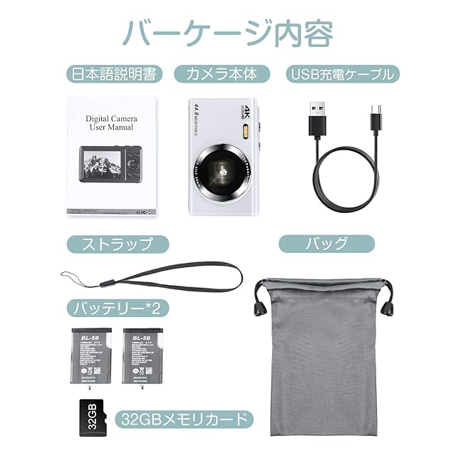 【パッケージ内容&安心保証】 デジタルカメラx1、充電式バッテリーx2、メモリーカード32gx1、Type-C USBケーブル×1、日本語取扱書×1、収納袋x1、ストラップ×1。【安心保証】本製品には、ご購入日より1年の保証期間があります。ご購入日より12ヶ月品質保証が用意しております。届いた商品に不具合などの内容がありましたら、「アカウントサービス」→「注文履歴」→「販売:出品者名」→「質問する」でお気軽にお問い合わせください。