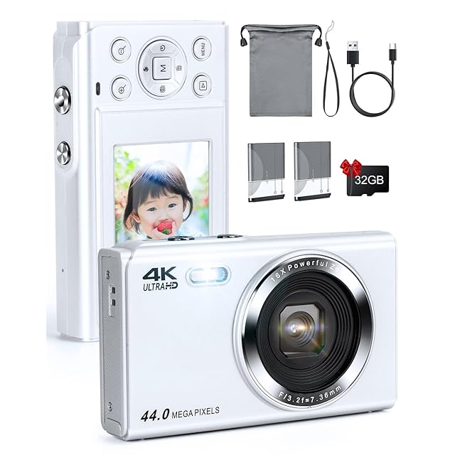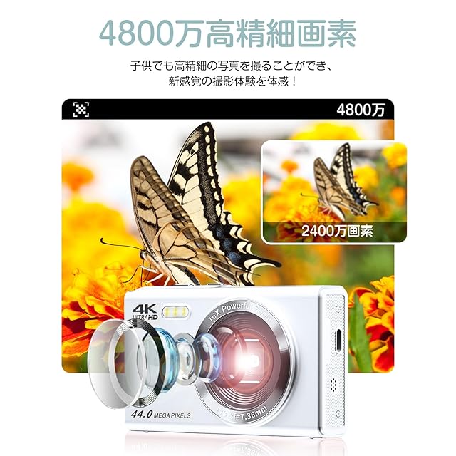 LAMA デジカメ 4k デジタルカメラ コンパクト 4400万高画素 30FPS 16倍デジタルズーム AFオートフォーカス機能 大画面2.4インチ ポケットカメラ 軽量 携帯便利 子供用 青少年 大人初心者向け 日本語説明書 1200mAhバッテリー 2個搭載 ホワイト