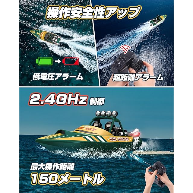 【低電圧アラーム&超距離アラーム&制御距離最大150m】ラジコンボートは低電力時に警告機能があり、バッテリー残量が足りない場合、あるいは、操作距離を超える場合、リモコンからアラームします。ボートを運転して戻ってくるように注意し、水上でボートを失うことを避けてください。このレースボートの制御距離は最大150メートルです。