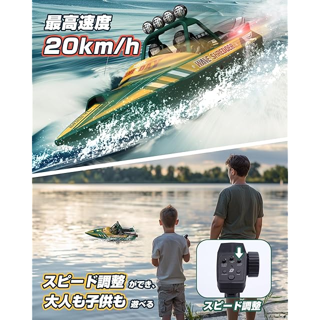 【20KM/H高速RCボート&防水デザイン】アップグレードされたRCボートは最大20KM/Hの高速で、実体験感をもたらします。大人と子供にも楽しめます。ラジコンボートは高強度で防水性に優れた素材があり、リモコンボートの水による損傷を防ぎます。