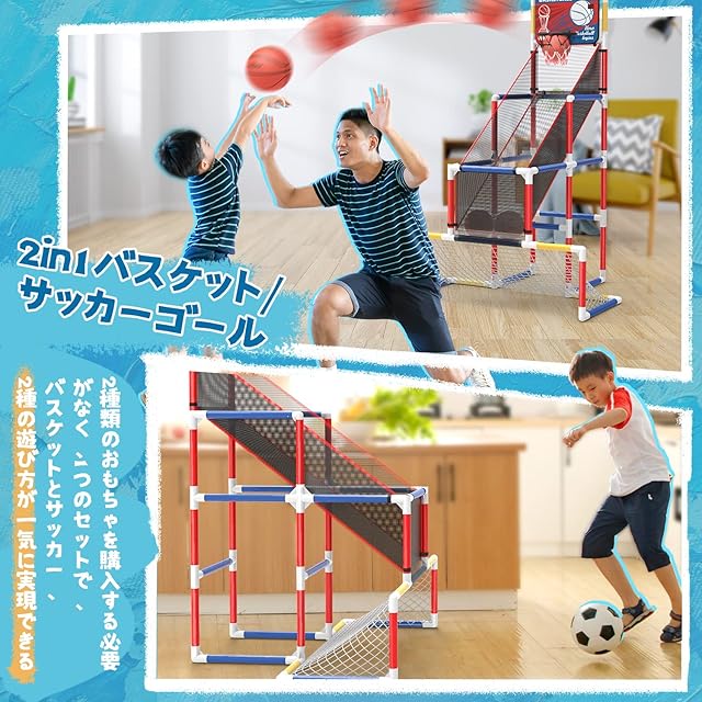 【2in1バスケット/サッカーゴール】ほかのバスケットゴールと違い、当製品はサッカーゴールを追加しました。2種類のおもちゃを購入する必要がなく、1つのセットで、バスケットとサッカー、2方の遊び方が一気に実現できるようになりました。また、バスケットボール*3、サッカーボール*1を付属されて、一人のスポーツゲームはもちろん、多人ゲームも適用されます。バスケットボール・サッカー、両方に興味のあるお子様へのプレゼントに最適です。