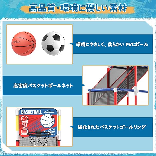 【高品質・環境に優しい素材】高密度バスケットボールネット、強化されたバスケットゴールリングで構成されたバスケットボール・サッカーゴールセットは、寿命が短いおもちゃではなく、長期使用できるおもちゃです。また、付属されたボールは環境にやさしく、柔らかい PVCで作られ、子供の肌に優しいです。直径15cmでお子様にも握りやすいサイズです。子供のバスケットボール・サッカー練習用おもちゃに最適です。