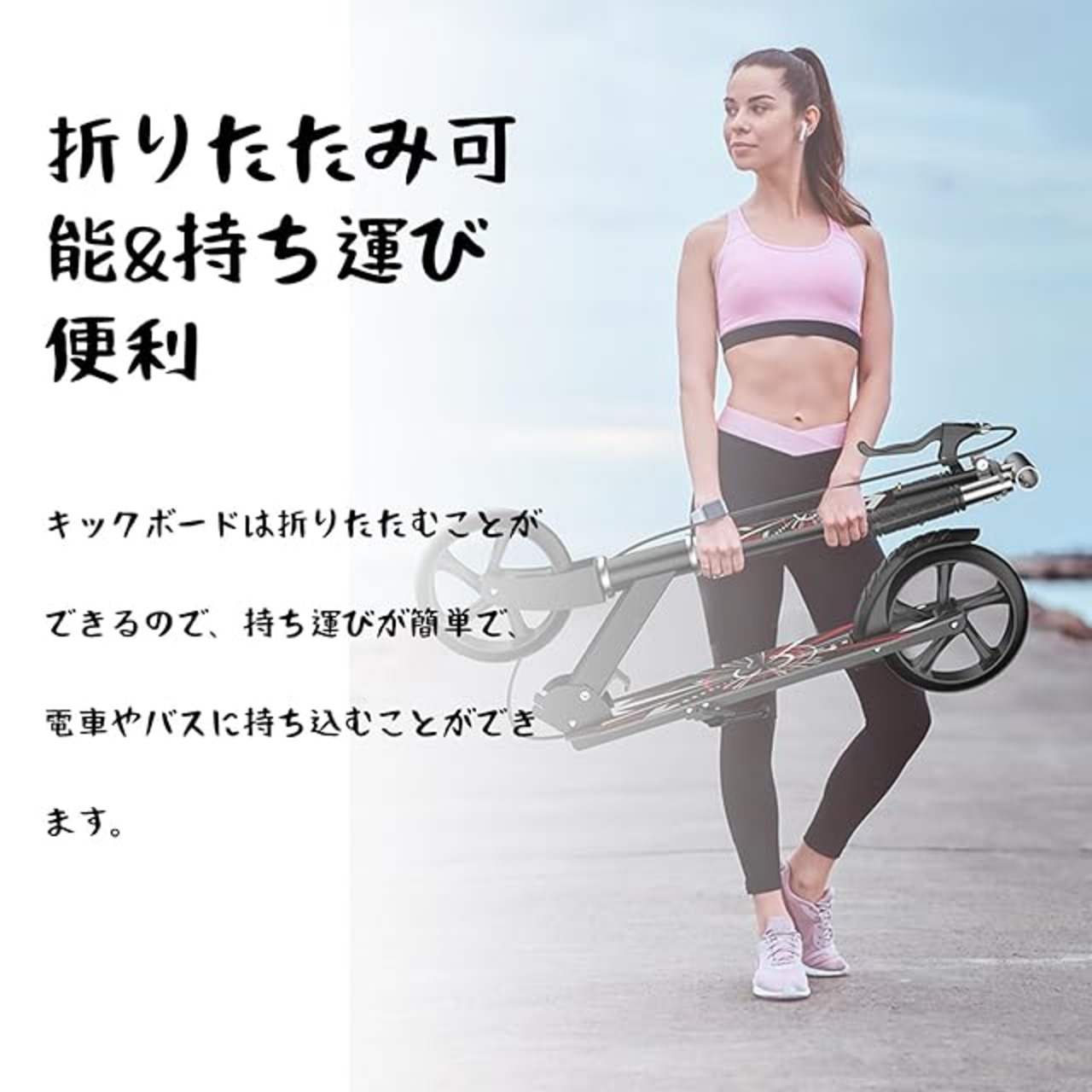 【高品質&安全性UP】本体は軽量で頑丈なアルミボディを採用。デッキ面が滑り止め加工を施したことで、安心で快適な滑りをサポートします。身長の大きな方でも安定する大幅のデッキと、大人の手でも握りやすい長さとグリップ性が強いラバーグリップで乗り心地に特化した、移動に便利なキックボードです。