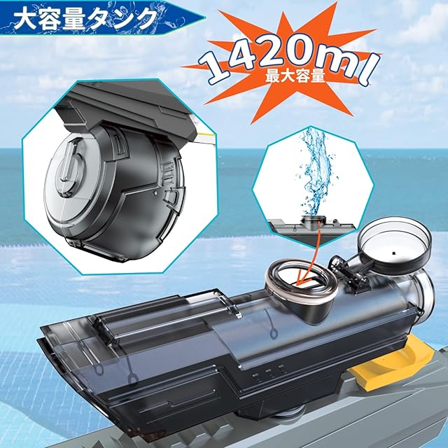 【大容量タンク】1420mlの大容量タンクを備えており、一度に多くの水を補充できるため、何度も水を足す手間が減ります。大容量、飛距離があり、フルオートで水が出るので水鉄砲バトルをやったら、無双できるのは間違いない。