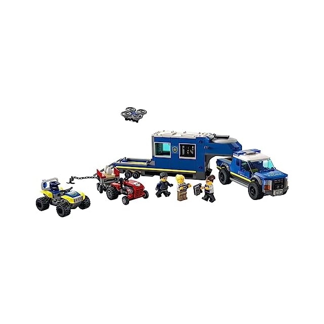 箱の中には何が入ってる – ピックアップトラック、牢屋を搭載したトレーラー、ドローン、オフロード車、トレーラー付きトラクターの組み立てに必要なパーツと、ミニフィギュア4体(レゴシティ アニメシリーズのキャラクター3体を含む)が付属しています。