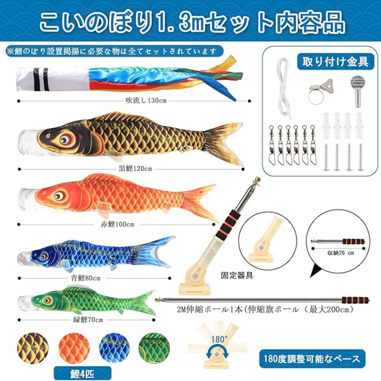 【鯉のぼり】新作「璀璨之鲤」セット内容:五色吹流し1.3m・黒鯉1.2m・赤鯉1 m・青鯉0.8m・緑鯉0.7m・ロープ・口金具・取り付け金具・説明書・2m伸縮スタンド付・専用収納ケース。全ての設置物がセットされているので、簡単にベランダやお庭に設置できます。※矢車は付属していません。
