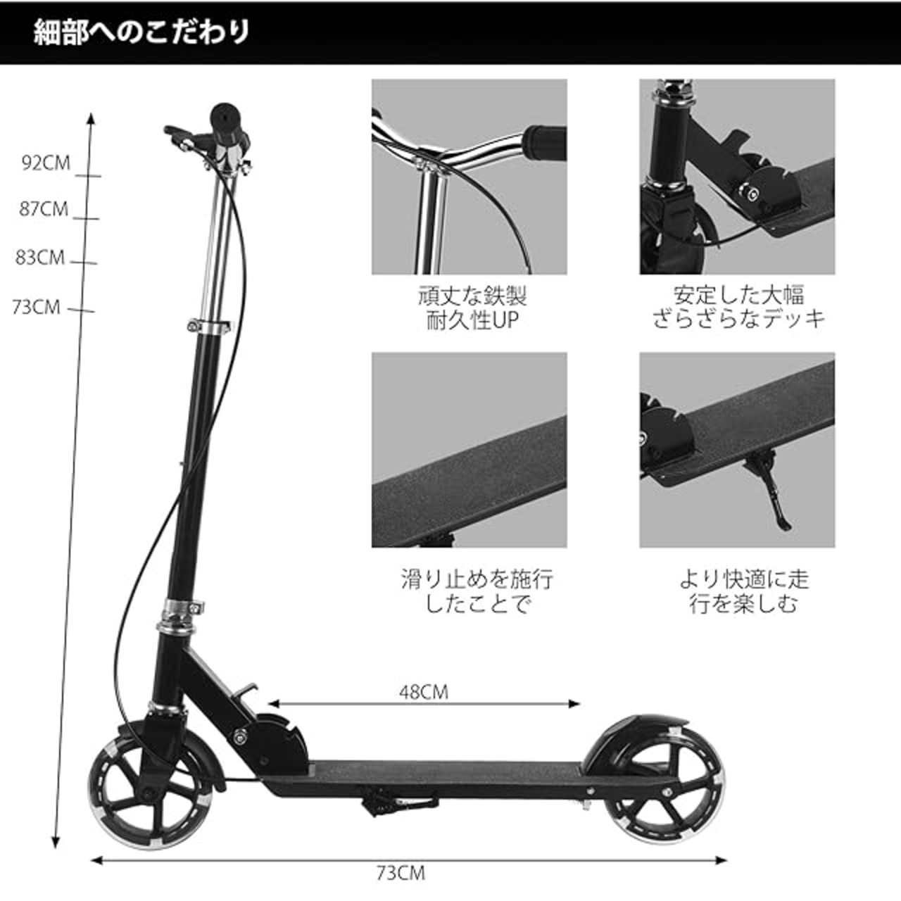 【高品質】本体は鉄とステンレススチールを採用し、頑丈で実用性がアップ!48*10㎝のデッキ面が広くてざらざらな滑り止め素材を採用したことで、安心で快適な滑ることをサポートします。背の高い方でも安定する大幅のデッキと、大人の手でも握りやすいハンドルが付くことで乗り心地に特化した、移動に便利なキックボードです。